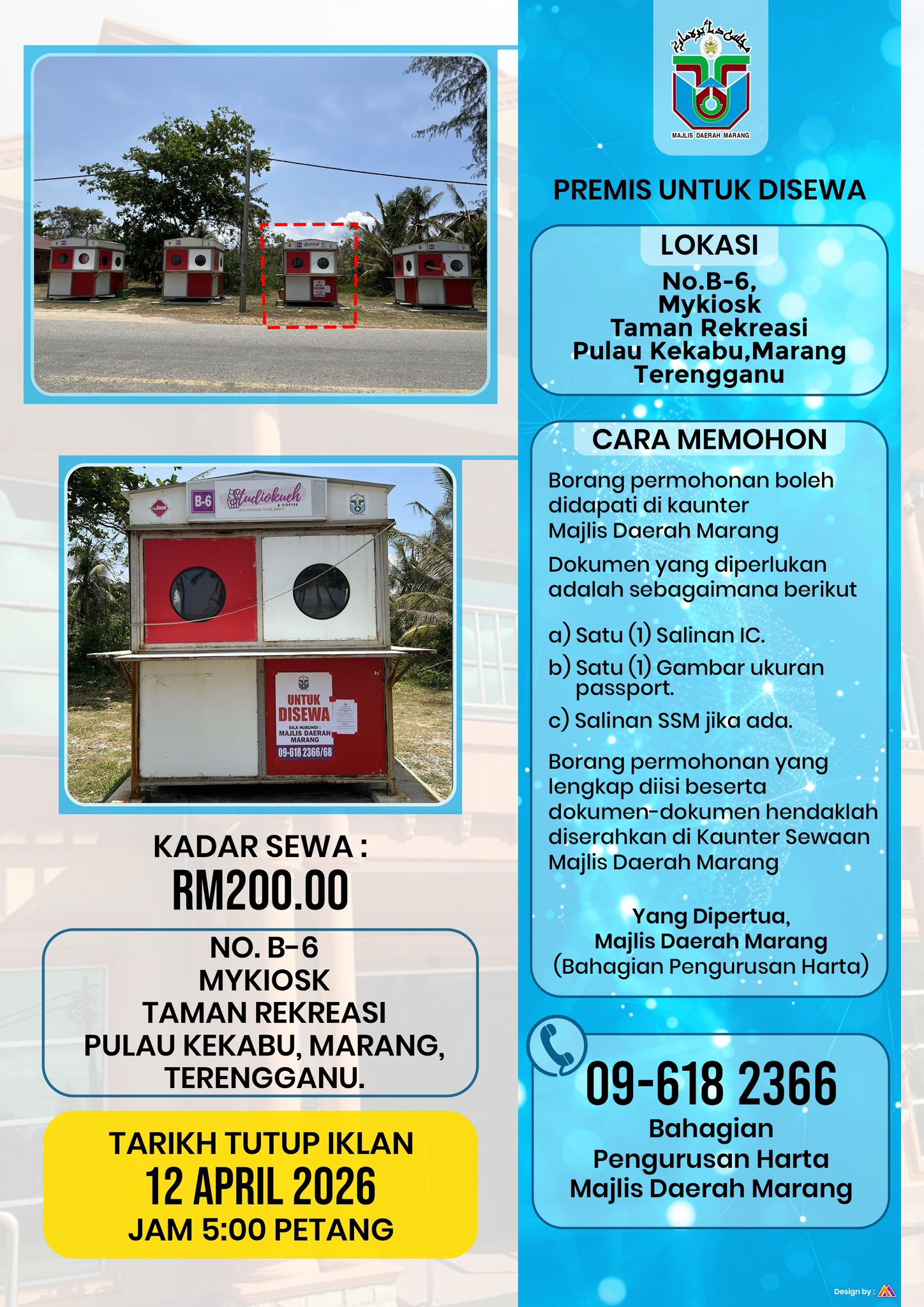Makluman: Sewa dewan & peralatan hendaklah dijelaskan sebelum tarikh penggunaan. Penghantaran peralatan dibuat selepas bayaran diterima. Untuk pertanyaan & tempahan: 09-618 2366 (Unit Kemudahan).